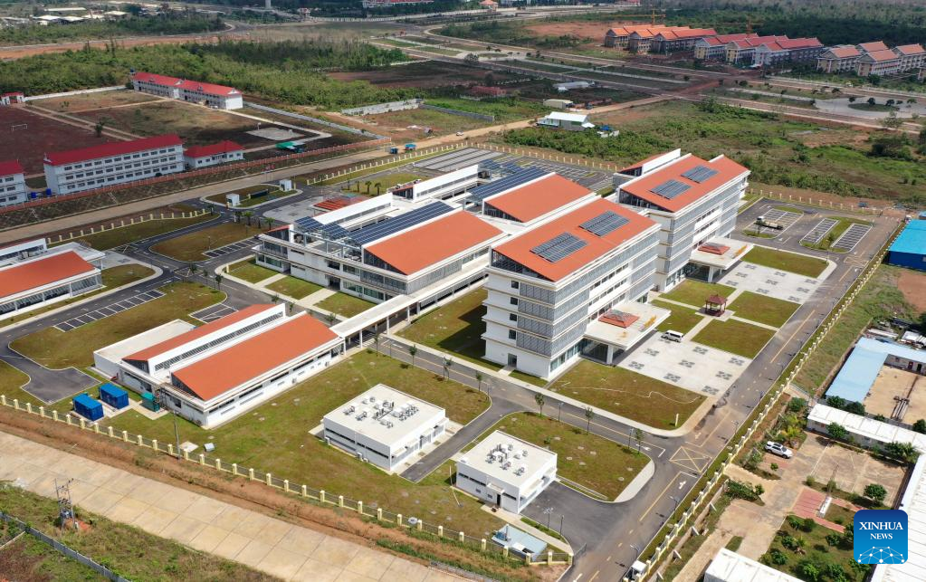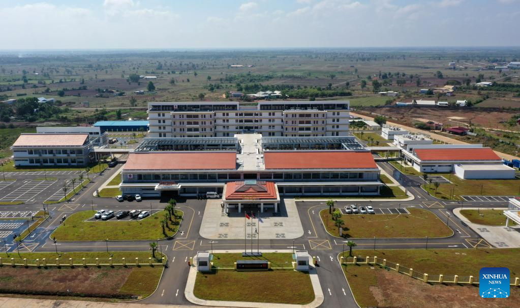Aerial photo taken on Feb. 17, 2022 shows the Cambodia-China Friendship Tboung Khmum Hospital in Tboung Khmum province, Cambodia. Cambodia has inaugurated a China-funded landmark hospital here on Monday, which is expected to significantly contribute to improving health care services in the country's eastern and northeastern regions. Officially named the Cambodia-China Friendship Tboung Khmum Hospital, the five-story hospital has 300 beds and is well-equipped with high-technology medical equipment for checkups, treatment and surgery. (Photo by Ly Lay/Xinhua)