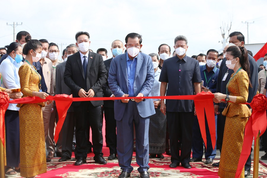 Cambodian Prime Minister Samdech Techo Hun Sen cuts the ribbon at the inauguration ceremony of the Chinese-built National Road No. 51 in Kampong Speu province, Cambodia, on March 25, 2022. (Photo by Ly Lay/Xinhua)