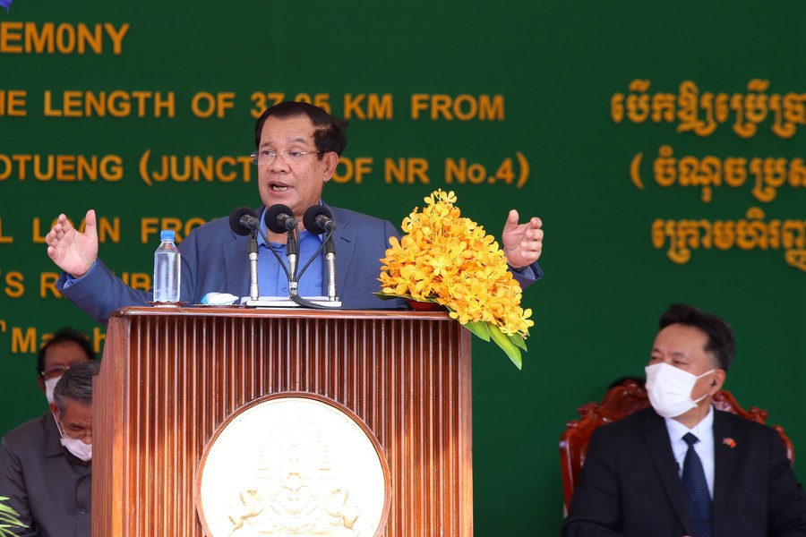 Cambodian Prime Minister Samdech Techo Hun Sen speaks at the inauguration ceremony of the Chinese-built National Road No. 51 in Kampong Speu province, Cambodia, on March 25, 2022. (Photo by Ly Lay/Xinhua)