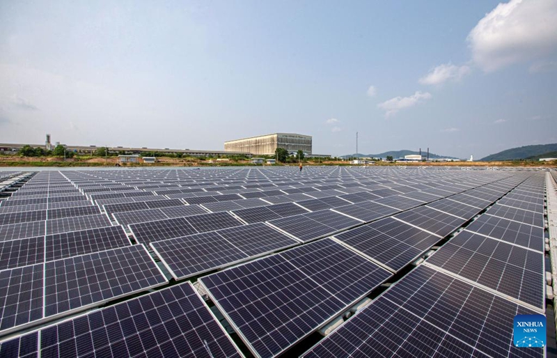 Photo taken on April 11, 2022 shows the solar floating project in Rayong, Thailand. The solar floating project in Rayong province was constructed by Banpu Company of Thailand with support of Chinese technology company Huawei. (Xinhua/Wang Teng)