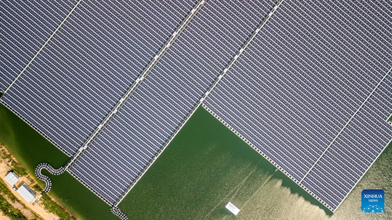 Aerial photo taken on April 11, 2022 shows the solar floating project in Rayong, Thailand. The solar floating project in Rayong province was constructed by Banpu Company of Thailand with support of Chinese technology company Huawei. (Xinhua/Wang Teng)