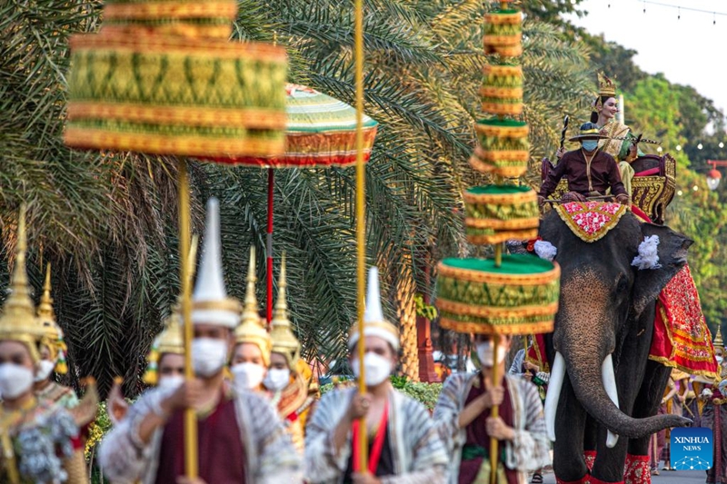 Performers participate in a street parade celebrating the Songkran Festival in Ayutthaya, Thailand, April 13, 2022. The Tourism Authority of Thailand held a street parade in Ayutthaya to celebrate the Songkran Festival. From April 13 to 15 every year is the traditional Thai New Year Songkran Festival. People will express their greetings by splashing water on each other. Affected by the COVID-19, Thailand has cancelled the street splashing celebration for the third consecutive year. (Xinhua/Wang Teng)