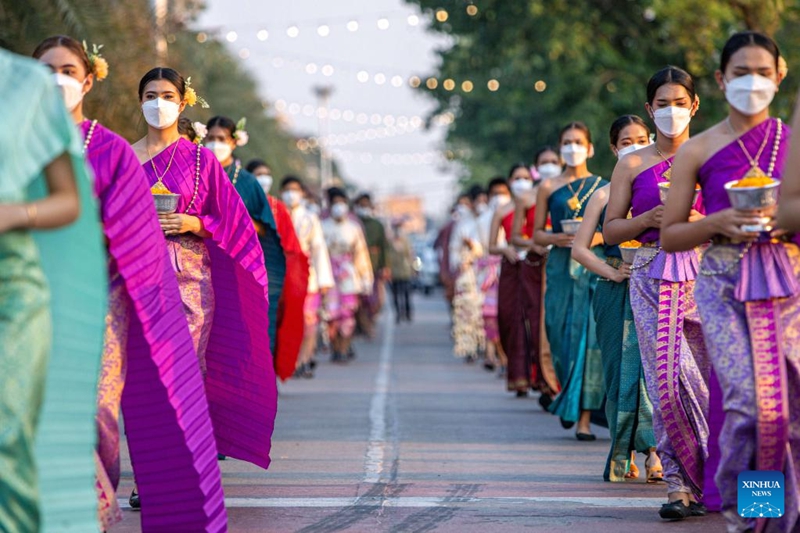 Performers participate in a street parade celebrating the Songkran Festival in Ayutthaya, Thailand, April 13, 2022. The Tourism Authority of Thailand held a street parade in Ayutthaya to celebrate the Songkran Festival. From April 13 to 15 every year is the traditional Thai New Year Songkran Festival. People will express their greetings by splashing water on each other. Affected by the COVID-19, Thailand has cancelled the street splashing celebration for the third consecutive year. (Xinhua/Wang Teng)