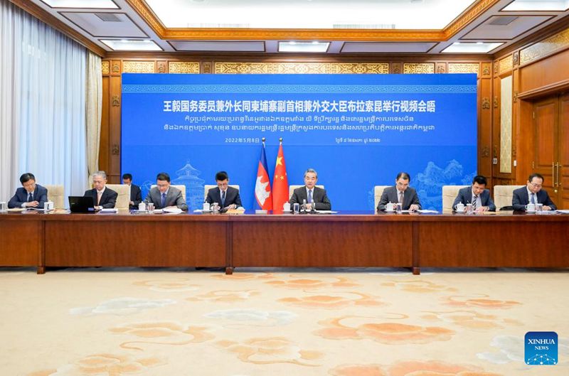 Chinese State Councilor and Foreign Minister Wang Yi meets with Cambodian Deputy Prime Minister and Foreign Minister Prak Sokhonn via video link, May 8, 2022. (Xinhua/Gao Jie)