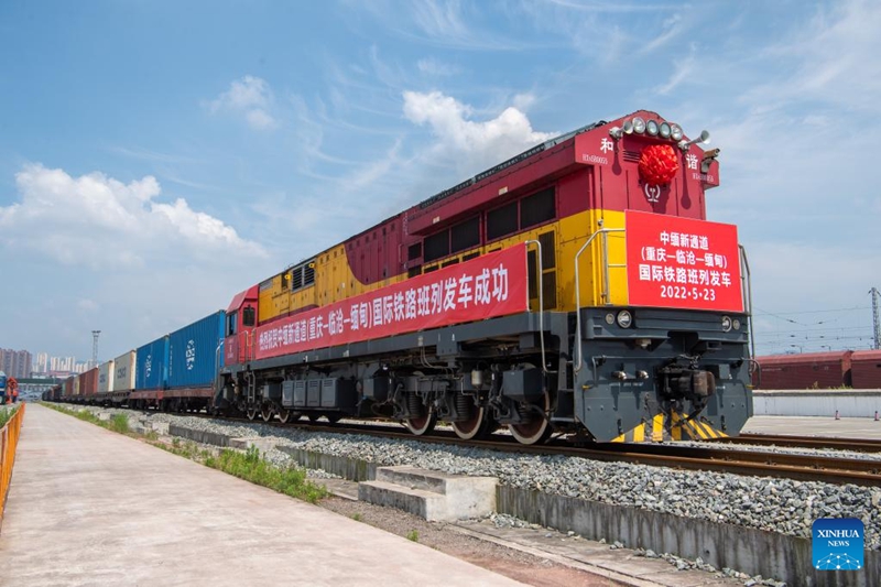 The first international freight train linking Chongqing and Lincang in southwest China with Myanmar is about to set off from the Yuzui station in Chongqing, southwest China, on May 23, 2022. Carrying 60 twenty-foot equivalent units (TEU) of mechanical equipment, electronic and auto parts, the train will pass through Lincang in southwest China's Yunnan province and arrive at Myanmar's Mandalay in about 15 days. This new freight train route can save about 20 days compared with traditional logistics routes and reduce 20 percent of logistics cost. (Xinhua/Tang Yi)