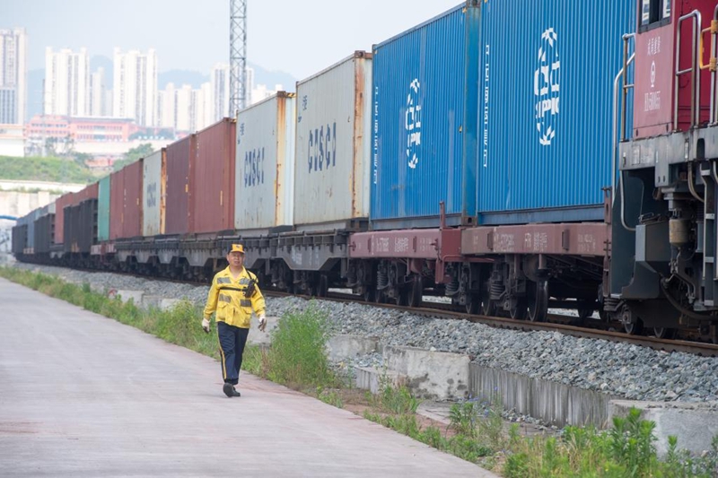 A staff member walks past an international freight train linking Chongqing and Lincang in southwest China with Myanmar at the Yuzui station in Chongqing, southwest China, on May 23, 2022. Carrying 60 twenty-foot equivalent units (TEU) of mechanical equipment, electronic and auto parts, the train will pass through Lincang in southwest China's Yunnan province and arrive at Myanmar's Mandalay in about 15 days. This new freight train route can save about 20 days compared with traditional logistics routes and reduce 20 percent of logistics cost. (Xinhua/Tang Yi)