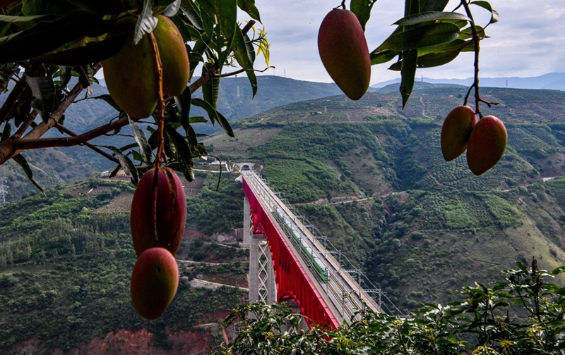 A Fuxing bullet train runs through Yuanjiang grand bridge on the China-Laos Railway in Southwest China's Yunnan Province, June 1, 2022. (Xinhua/Jiang Wenyao)