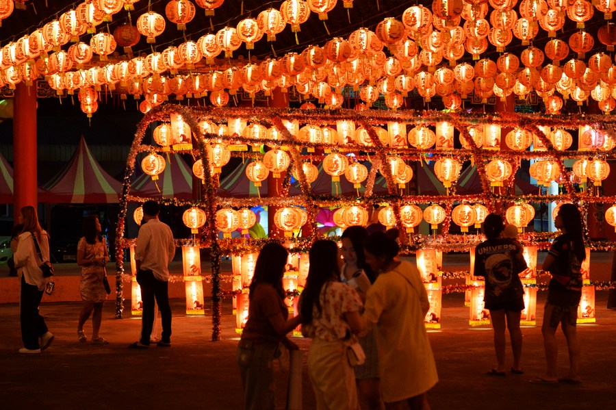 A lantern festival in Samut Prakan, Thailand is held to celebrate the Spring Festival with colorful lanterns yielding warm light.