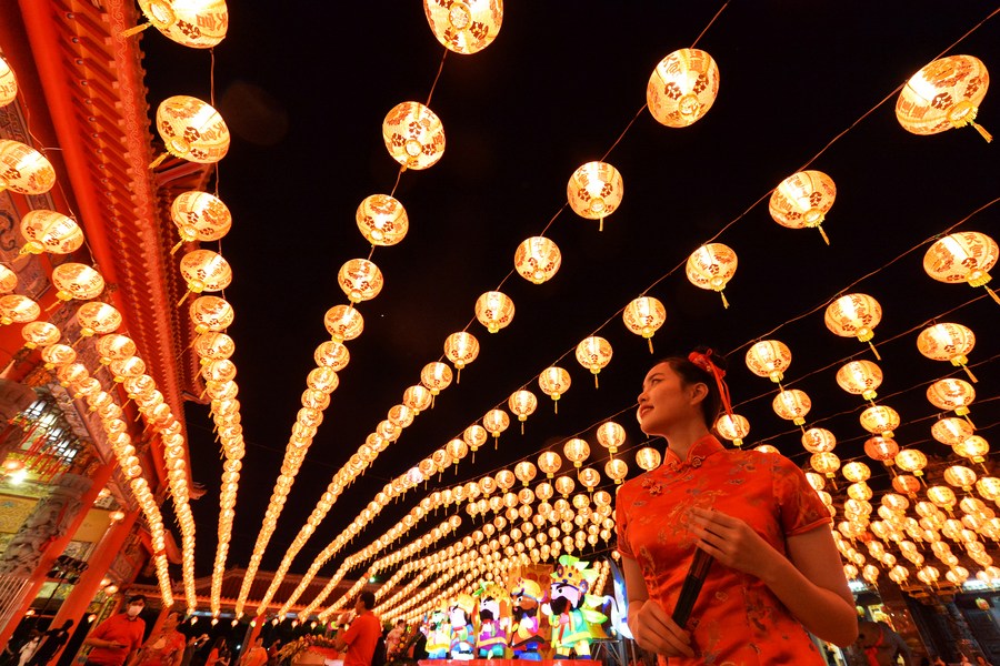 People dress up in new clothes including Cheongsam and enjoy the auspicious festive atmosphere with families and friends, appreciating colorful lanterns which symbolize health, harmony and prosperity.