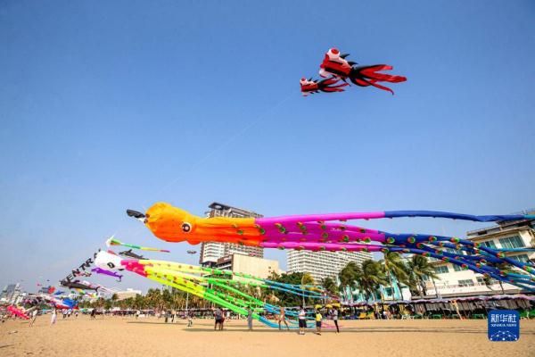 Kites are pictured above the beach in Pattaya, Thailand, Feb. 27, 2023. Pattaya hosts the International Kite on the Beach festival from Feb. 24 to 28.  (Xinhua/Wang Teng)