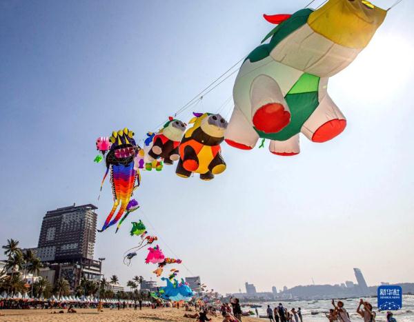 Kites are pictured above the beach in Pattaya, Thailand, Feb. 27, 2023. Pattaya hosts the International Kite on the Beach festival from Feb. 24 to 28.  (Xinhua/Wang Teng)