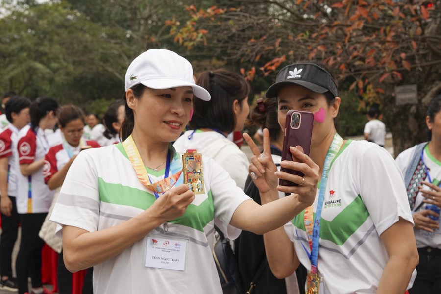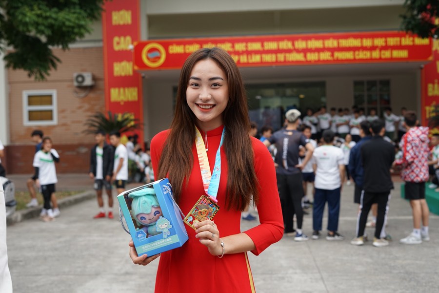 A young woman poses for a photo with Hangzhou Asian Games souvenirs after the Hangzhou Asian Games Fun Run at Bac Ninh Sports University, in northern Vietnam's Bac Ninh province on March 8, 2023. (Xinhua/Hu Jiali)Participants take photos with a medal after the Hangzhou Asian Games Fun Run at Bac Ninh Sports University, in northern Vietnam's Bac Ninh province on March 8, 2023. (Xinhua/Hu Jiali)Participants pose for photos after the Hangzhou Asian Games Fun Run at Bac Ninh Sports University, in northern Vietnam's Bac Ninh province on March 8, 2023. (Xinhua/Hu Jiali)