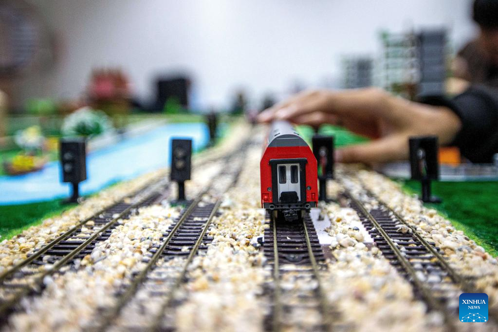 This photo taken on March 14, 2023 shows the high-speed railway operation sand table at the Luban Workshop of Ayutthaya Technical College in Ayutthaya, Thailand. The Luban Workshop, a Chinese vocational workshop program training talents overseas, was first inaugurated in Ayutthaya Technical College in March 2016. The workshop is named after Lu Ban, an ancient Chinese craftsman that represents the Chinese tradition of craftsmanship spirit. This workshop and its training center for railway talents have trained many students for Thailand in the past seven years. (Xinhua/Wang Teng)