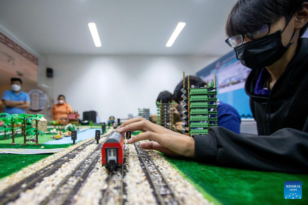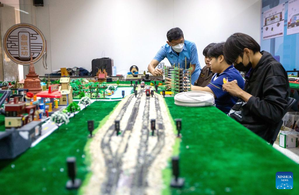 Students study at the high-speed railway operation sand table teaching area of the Luban Workshop in Ayutthaya Technical College in Ayutthaya, Thailand, March 14, 2023. The Luban Workshop, a Chinese vocational workshop program training talents overseas, was first inaugurated in Ayutthaya Technical College in March 2016. The workshop is named after Lu Ban, an ancient Chinese craftsman that represents the Chinese tradition of craftsmanship spirit. This workshop and its training center for railway talents have trained many students for Thailand in the past seven years. (Xinhua/Wang Teng)