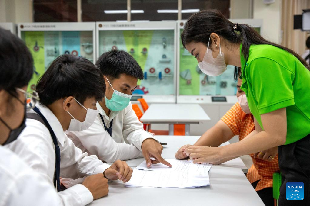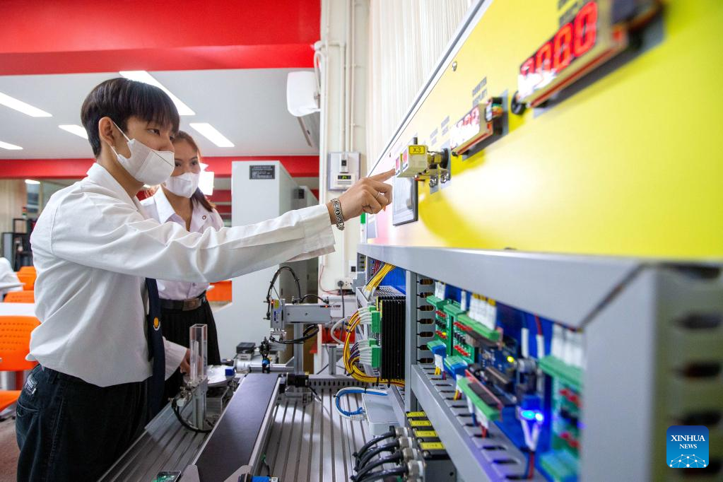 Students operate an installation system of automation production line at the Luban Workshop of Ayutthaya Technical College in Ayutthaya, Thailand, March 14, 2023. The Luban Workshop, a Chinese vocational workshop program training talents overseas, was first inaugurated in Ayutthaya Technical College in March 2016. The workshop is named after Lu Ban, an ancient Chinese craftsman that represents the Chinese tradition of craftsmanship spirit. This workshop and its training center for railway talents have trained many students for Thailand in the past seven years. (Xinhua/Wang Teng)