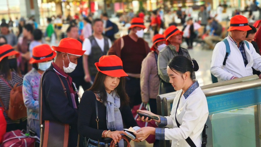 Passengers have their tickets checked at Vientiane Station of the China-Laos Railway in Vientiane, Laos, Jan. 26, 2024. (Photo by Yang Yongquan/Xinhua)Crew members of the Lane Xang electric multiple unit (EMU) trains are seen at Vientiane Station of the China-Laos Railway in Vientiane, Laos, Jan. 26, 2024. (Photo by Yang Yongquan/Xinhua)Passengers prepare to board a train at Vientiane Station of the China-Laos Railway in Vientiane, Laos, Jan. 26, 2024. (Photo by Yang Yongquan/Xinhua)