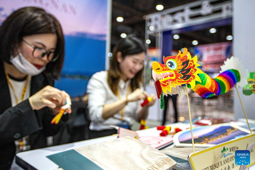 Staff members are seen at the booth of China's Zhejiang Province during the 29th Thailand International Travel Fair in Bangkok, Thailand, Jan. 25, 2024. The fair kicked off here on Thursday and will last until Jan. 28. (Xinhua/Wang Teng)