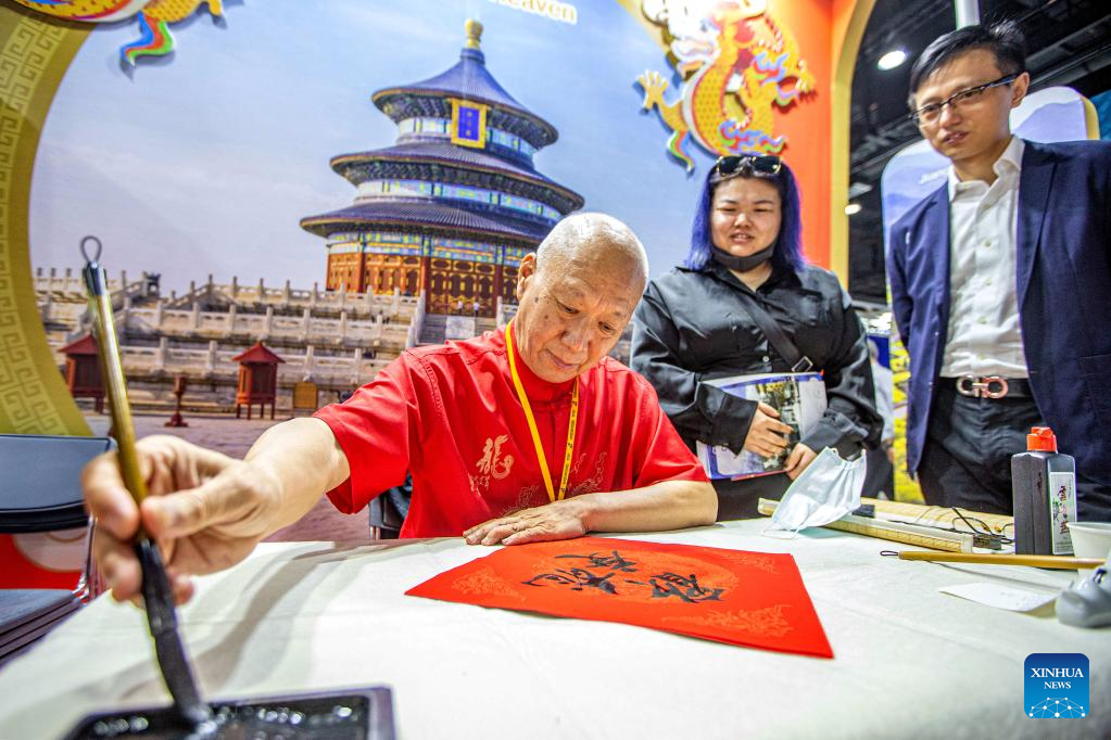A staff member demonstrates calligraphy skills at a booth of China during the 29th Thailand International Travel Fair in Bangkok, Thailand, Jan. 25, 2024. The fair kicked off here on Thursday and will last until Jan. 28. (Xinhua/Wang Teng)