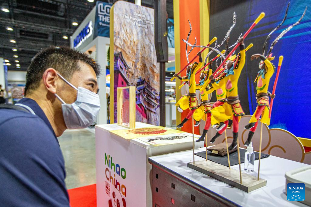 A visitor watches exhibits at a booth of China during the 29th Thailand International Travel Fair in Bangkok, Thailand, Jan. 25, 2024. The fair kicked off here on Thursday and will last until Jan. 28. (Xinhua/Wang Teng)