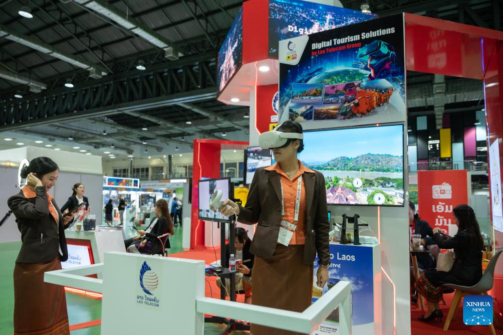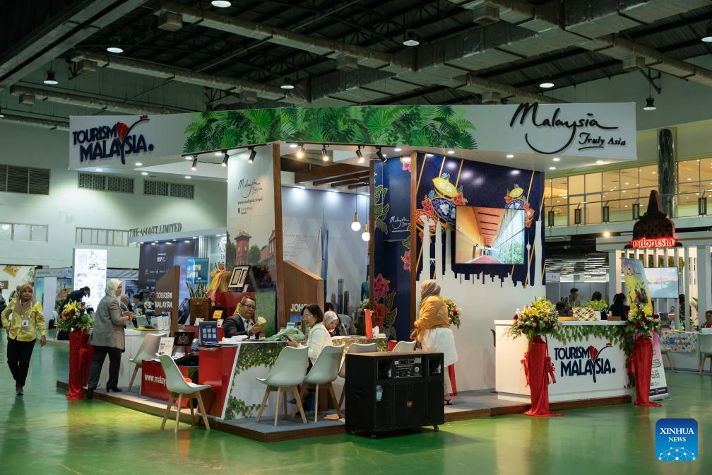 This photo taken on Jan. 25, 2024 shows a scene at the ASEAN Tourism Exhibition held in Vientiane, capital of Laos. The ASEAN Tourism Exhibition kicked off here on Monday and will last till Jan. 27. (Photo by Kaikeo Saiyasane/Xinhua)