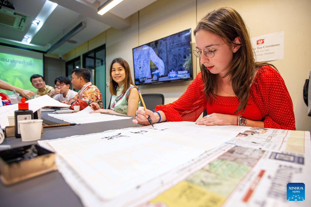 Students write Chinese calligraphy during an event celebrating the upcoming Chinese Lunar New Year, or the Spring Festival, at Thammasat University in Bangkok, Thailand, Feb. 5, 2024. (Xinhua/Wang Teng)