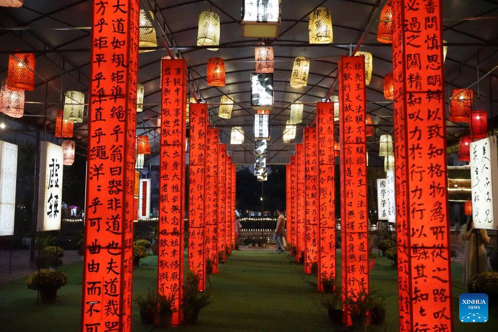 Chinese calligraphy works are displayed at Temple of Literature and Imperial Academy in Hanoi, Vietnam, Feb. 4, 2024. An annual calligraphy festival was held in Hanoi from Feb. 3 to 19, 2024. Dozens of calligraphers from the country were invited to the event to write for the public. (Xinhua/Hu Jiali)