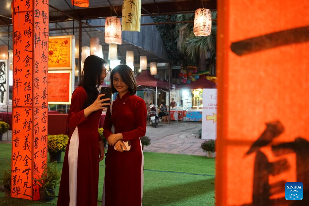 People from Vietnam take photos of Chinese calligraphy works at Temple of Literature and Imperial Academy in Hanoi, Vietnam, Feb. 4, 2024. An annual calligraphy festival was held in Hanoi from Feb. 3 to 19, 2024. Dozens of calligraphers from the country were invited to the event to write for the public. (Xinhua/Hu Jiali)