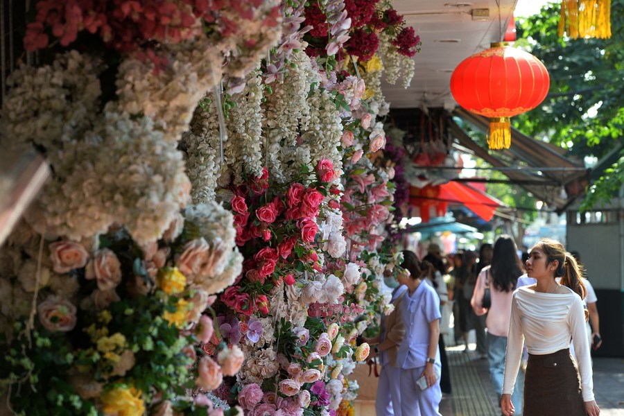 Red lanterns are hung high over Yaowarat Road, where Chinatown in the Thai capital of Bangkok is located, and shops are well prepared, as it is a golden opportunity to cater to Chinese tourists coming here to spend their Lunar New Year holidays.