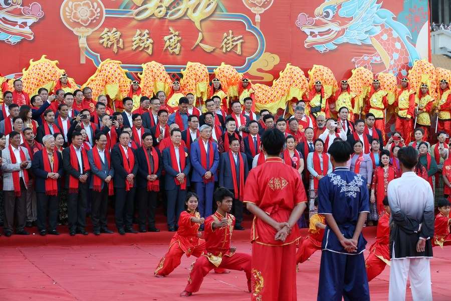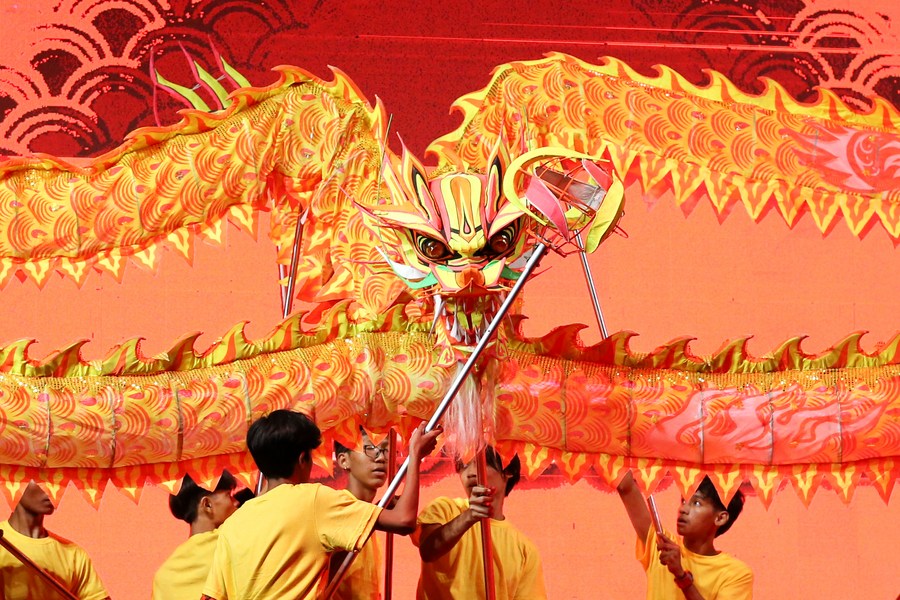 Dancers perform during a Chinese New Year celebration in Yangon, Myanmar, Feb. 18, 2024. (Xinhua/ Myo Kyaw Soe)Participants attend a Chinese New Year celebration in Yangon, Myanmar, Feb. 18, 2024. (Xinhua/ Myo Kyaw Soe)Participants pose for a group photo during a Chinese New Year celebration in Yangon, Myanmar, Feb. 18, 2024. (Xinhua/ Myo Kyaw Soe)