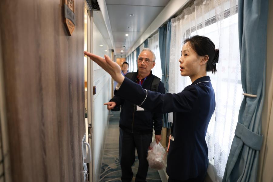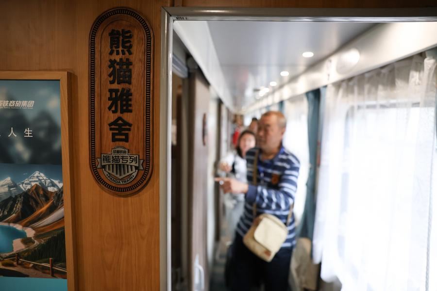 A tourist train, decorated with images, paintings and mascots of the panda and named as "Panda Train", linking Guiyang, Xishuangbanna and Laos, departed from Guiyang on Wednesday.