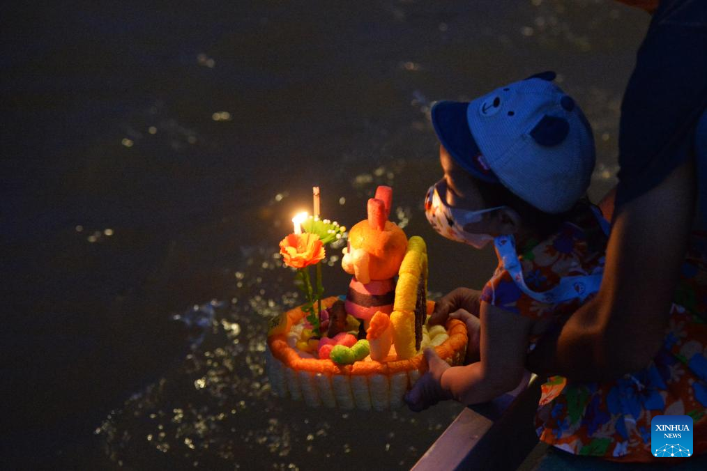 A child releases a water lantern during the Loy Krathong Festival by the Chao Phraya River in Ayutthaya, Thailand, Nov. 15, 2024. (Xinhua/Rachen Sageamsak)