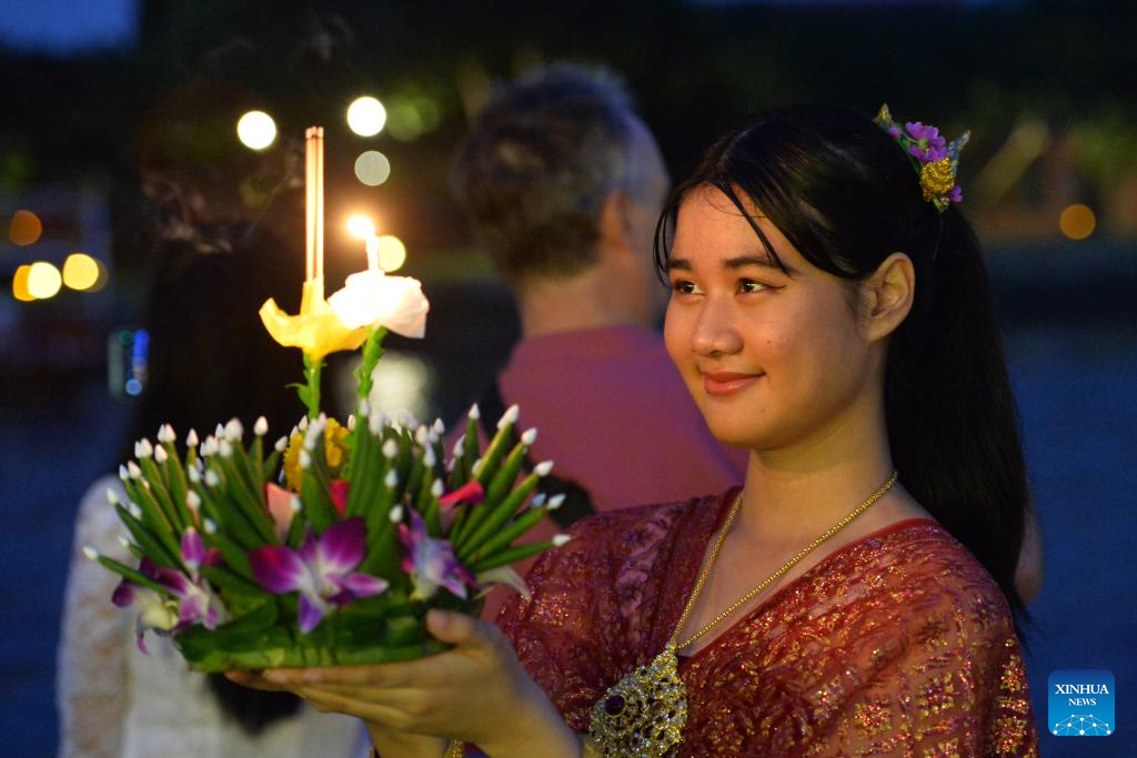 A woman prepares to release a water lantern during the Loy Krathong Festival by the Chao Phraya River in Ayutthaya, Thailand, Nov. 15, 2024. (Xinhua/Rachen Sageamsak)