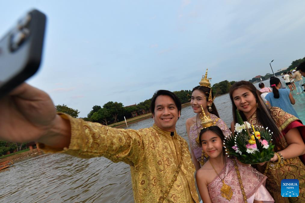 People take selfies with a water lantern during the Loy Krathong Festival by the Chao Phraya River in Ayutthaya, Thailand, Nov. 15, 2024. (Xinhua/Rachen Sageamsak)