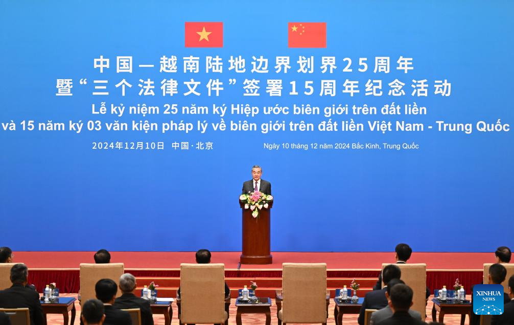 Chinese Foreign Minister Wang Yi, also a member of the Political Bureau of the Communist Party of China Central Committee, and Deputy Prime Minister and Foreign Minister of Vietnam Bui Thanh Son attend events commemorating the 25th anniversary of the demarcation of the land boundary of the two countries and the 15th anniversary of the signing of the three legal documents on China-Vietnam land border and related land ports management, in Beijing, capital of China, Dec. 10, 2024. (Xinhua/Yue Yuewei)