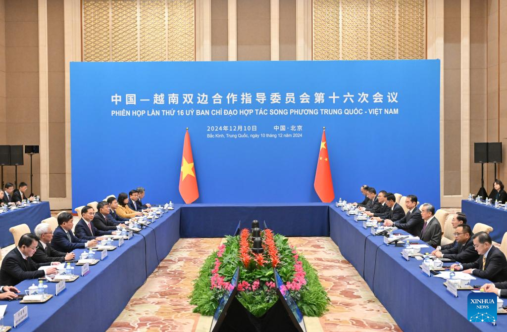Chinese Foreign Minister Wang Yi, also a member of the Political Bureau of the Communist Party of China Central Committee, co-chairs the 16th meeting of the China-Vietnam Steering Committee for Bilateral Cooperation with Deputy Prime Minister and Foreign Minister of Vietnam Bui Thanh Son in Beijing, capital of China, Dec. 10, 2024. (Xinhua/Yue Yuewei)