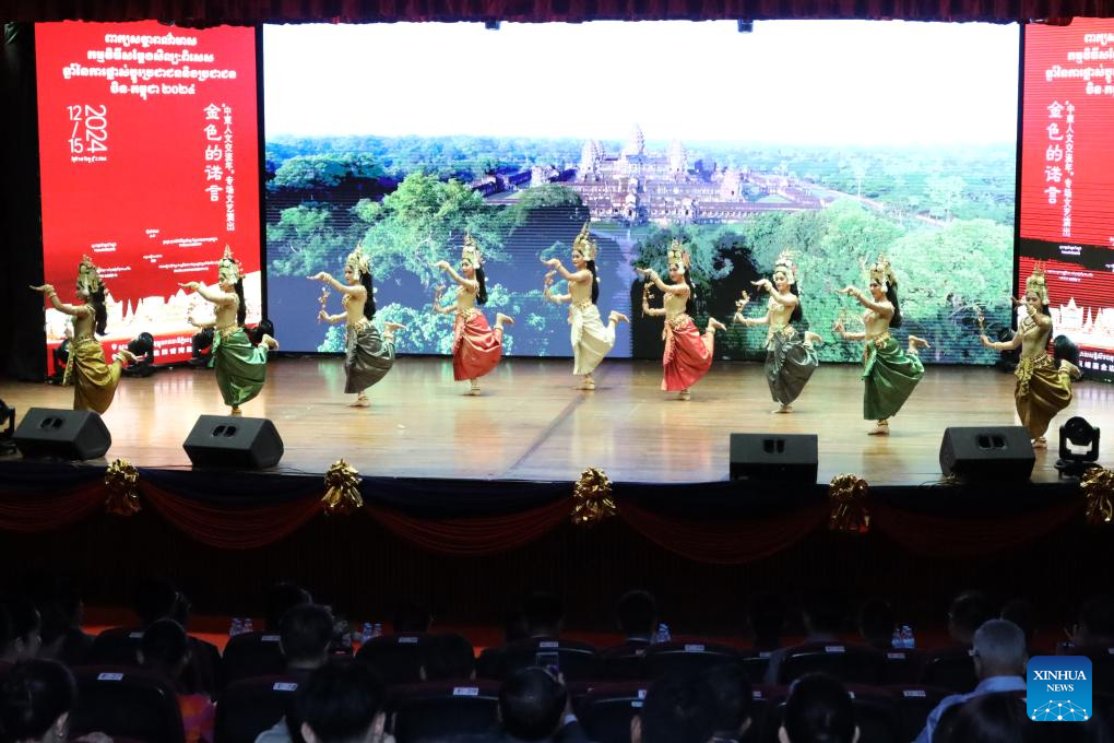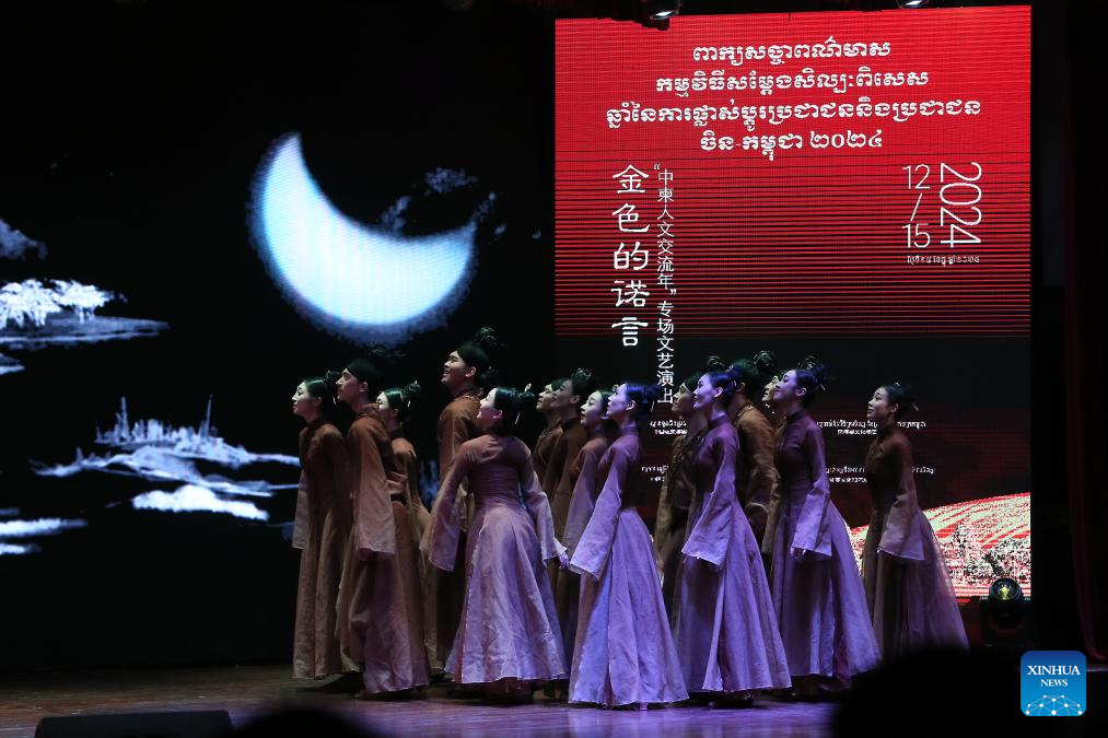 Chinese artists from Wuxi City in east China's Jiangsu Province perform during a Cambodia-China cultural show in Phnom Penh, Cambodia on Dec. 15, 2024. The "Golden Promise 2024," a China-Cambodia cultural show, was staged here Sunday evening to celebrate the people-to-people exchange year, attracting hundreds of spectators. (Photo by Phearum/Xinhua)