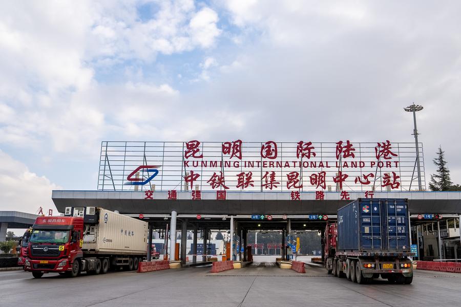 Trucks transport railway containers at the Kunming cargo terminal of China United International Rail Containers Co., Ltd. (CRIntermodal) in Kunming, southwest China's Yunnan Province, on Jan. 2, 2025. (Xinhua/Hu Chao)