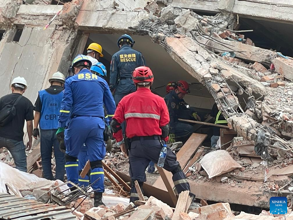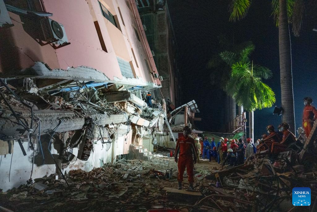 Meanwhile, more Chinese rescue teams are heading to Myanmar, bringing in earthquake experts, structural engineers, medical personnel and canine units, as well as life detectors, demolition equipment and field hospital systems. (Photo by Myo Kyaw Soe/Xinhua)