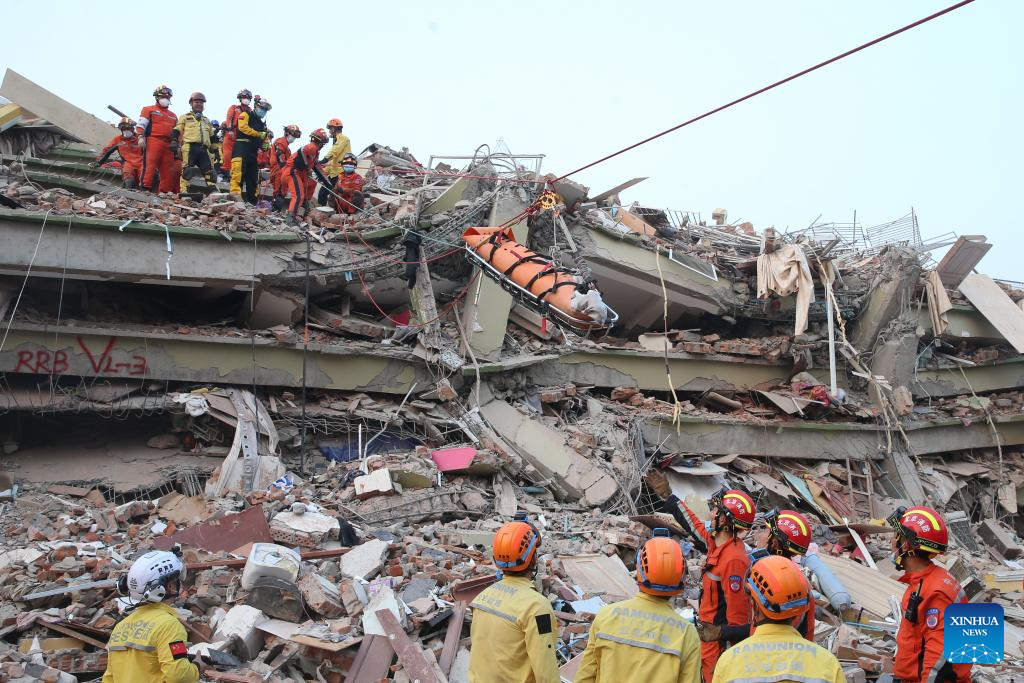 Members from the China Search and Rescue Team transfer a survivor at a quake site in Mandalay city, Myanmar, March 31, 2025. Following the devastating earthquake in Myanmar, multiple Chinese rescue teams have arrived in the disaster-stricken areas, working with local responders around the clock to search for survivors.