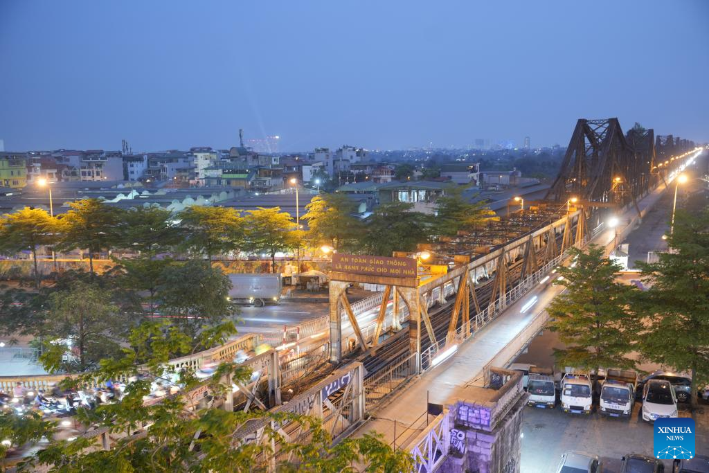 This photo taken on April 9, 2025 shows a view of Long Bien Bridge, a historic bridge across the Red River, in Hanoi, Vietnam.