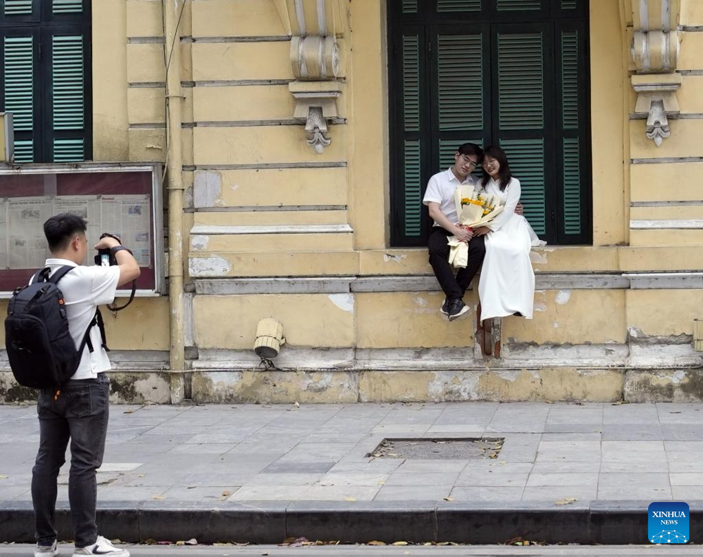 A couple pose for photos on the street in Hanoi, Vietnam, April 9, 2025.