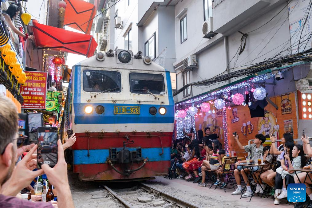 A train runs past train street in Hanoi, Vietnam, April 13, 2025.