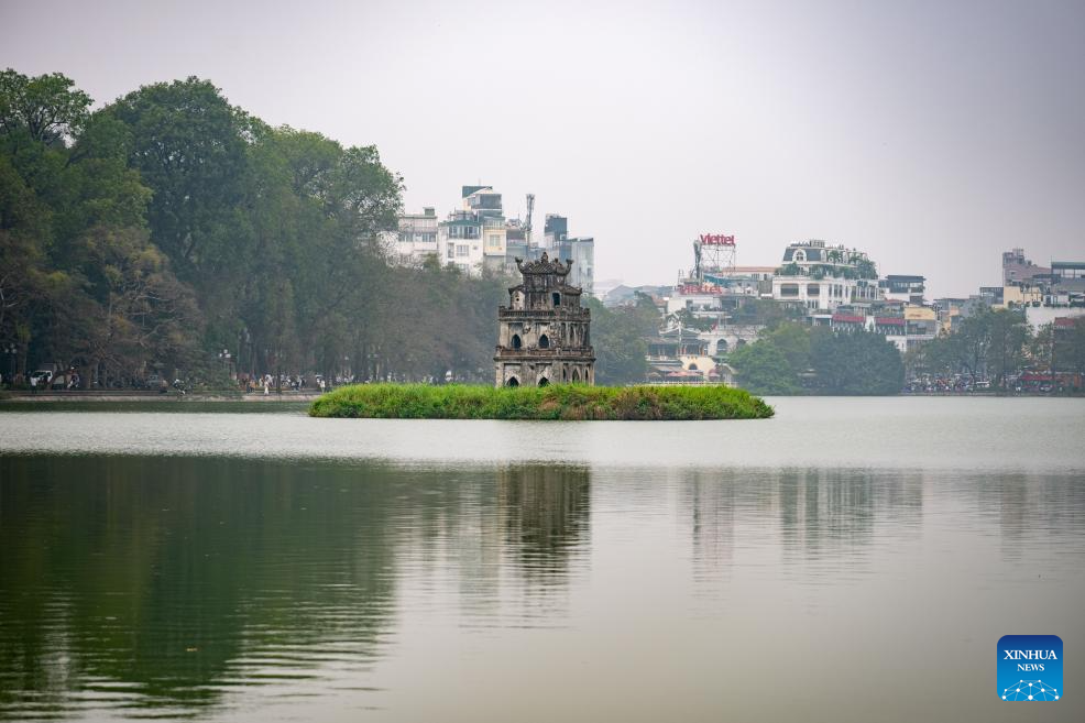 This photo taken on March 26, 2025 shows the Turtle Tower on Hoan Kiem Lake, in Hanoi, Vietnam.