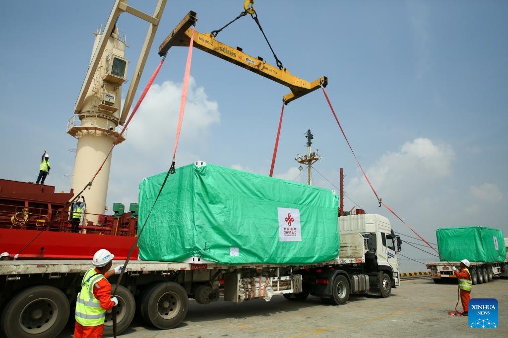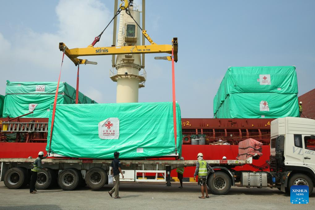 This photo taken on May 10, 2025 shows the 13th batch of emergency humanitarian aid supplies dispatched by the Chinese government in Yangon, Myanmar. The emergency humanitarian assistance was handed over to Myanmar here on Saturday. (Photo by Haymhan Aung/Xinhua)