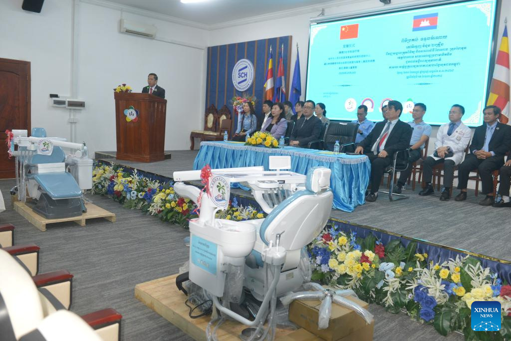 PHNOM PENH, Oct. 13 (Xinhua) -- China on Monday donated two sets of state-of-the-art dental treatment chairs to Cambodia to help improve the quality of oral healthcare services for Cambodian children.