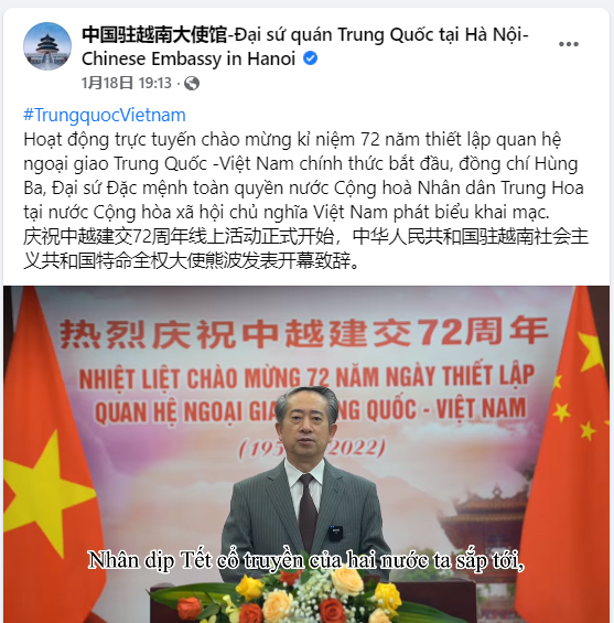 Theo Tan Hoa x?: Ngày 18/1, ??i s? quán Trung Qu?c t?i Vi?t Nam t? ch?c ho?t ??ng tr?c tuy?n chào m?ng k? ni?m 72 n?m thi?t l?p quan h? ngo?i giao Trung Qu?c-Vi?t Nam. ??i s? Trung Qu?c t?i Vi?t Nam Hùng Ba, U? viên Trung ??ng ??ng, B? tr??ng B? Y t? Vi?t Nam Nguy?n Thanh Long l?n l??t phát bi?u, và phát video chuyên ?? v? quan h? Trung-Vi?t.