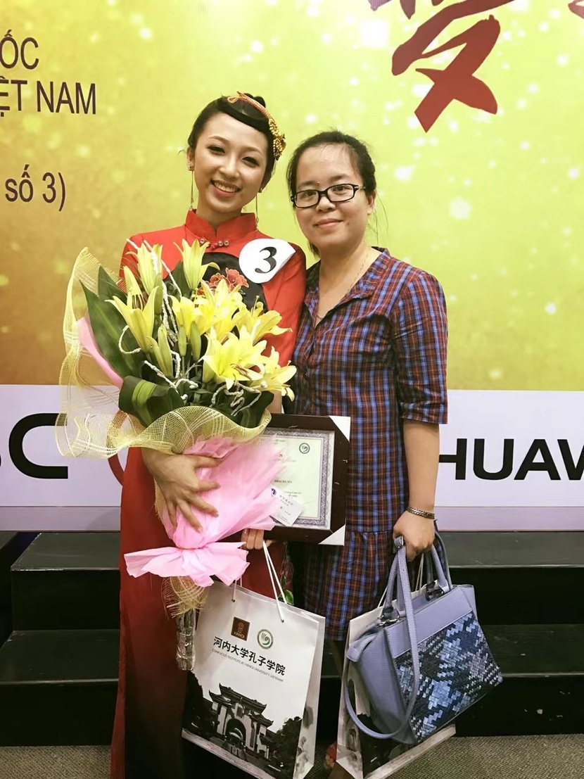 Ta?i cu??c thi chung kê?t cu?a khu v??c thi ?a?u Viê?t Nam, thi? sinh ?oa?t gia?i Nha?t Nguyê?n Thi? Ha? Ngan ?a? ba?y to? lo?ng biê?t ?n ???i v??i c? H??ng Giang, Ha? Ngan cho biê?t:“B?n than mình ?? g?n bó v?i ti?ng Trung t? khi h?c c?p 3, tính ??n nay ?? 5 n?m, m??i khi mi?nh mu??n b? cu?c thi, c? gia?o lu?n khuyê?n khi?ch mình m?i ti?p t?c tham gia. Tham gia cu??c thi Nh?p c?u Hán ng? la? c? h??i quy? giá, tin t??ng r?ng m?i duyên này s? ti?p t?c dài lau.”