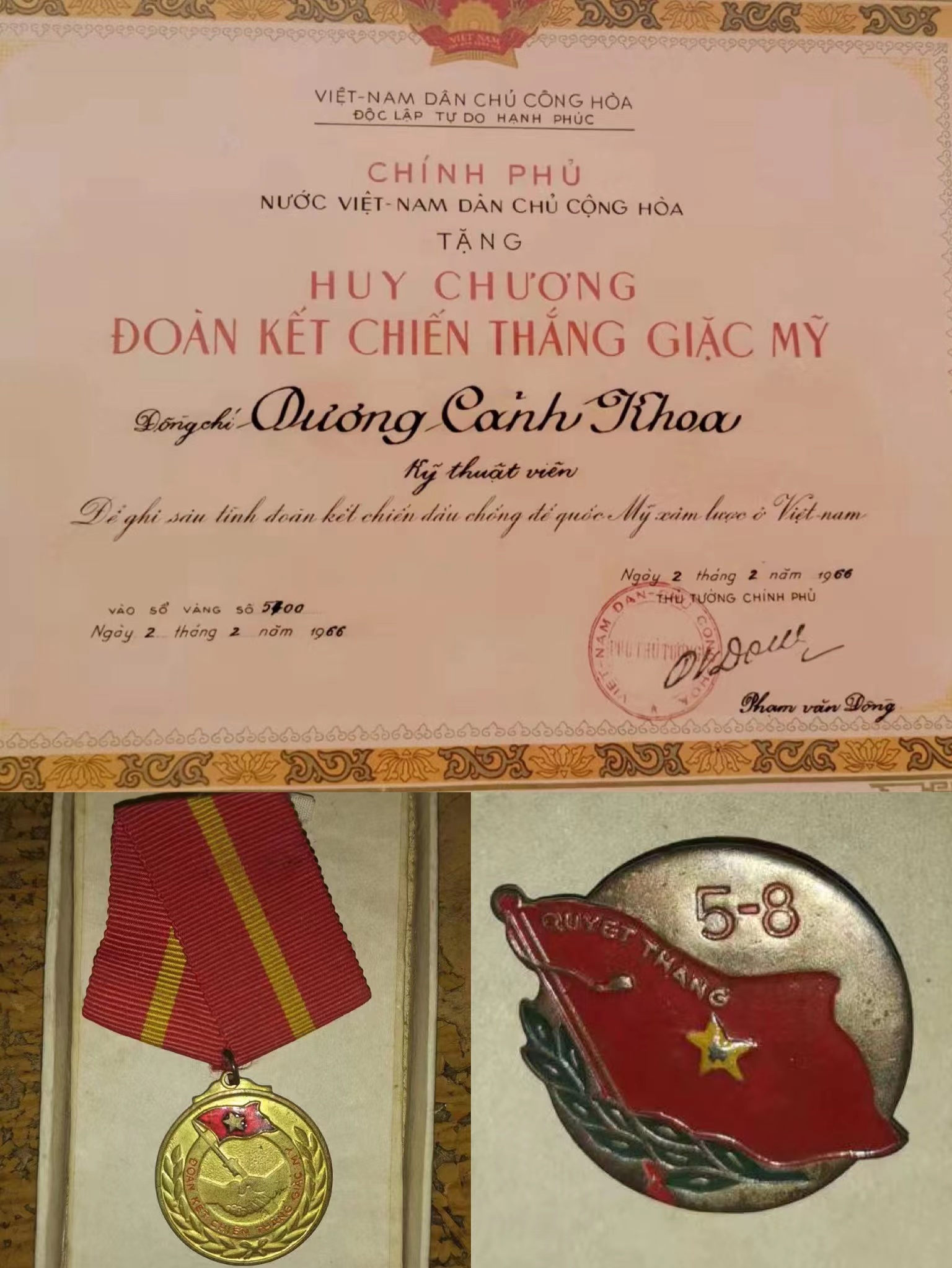 ?ay là"b?ng khen" ???c vi?t b?ng ti?ng Vi?t v?i nh?ng n?p g?p ? vàng và m?t t?m huy ch??ng quan ??i chói lóa. Nh?ng b?ng khen và huy ch??ng do chính ph? Vi?t Nam trao t?ng cho nh?ng ng??i lính Trung Qu?c viê?n tr? Vi?t Nam, d??ng nh? ?ang k? v? nh?ng n?m tháng cháy h?t mình trong giai ?o?n vi?n tr? Vi?t Nam trong cu?c chi?n ch?ng My?. Ng???i ????c trao b?ng khen là ?ng D??ng Ca?nh Khoa, cán b? vê? h?u thu??c Phòng K? thu?t c?a ?ài Phát thanh - Truy?n hình Trung ??ng Trung Qu??c và ng??i ????c trao huy ch??ng là ?ng Tr??ng A? Quang, cán b? vê? h?u cu?a C?c Khai thác Qu??ng Long Kh?u, t?nh S?n ??ng, Trung Qu?c. N?m 1966 và 1967, ?ng D??ng Ca?nh Khoa t?t nghi?p H?c vi?n Radar Kh?ng quan Trung Qu?c, ?? hai l?n sang Vi?t Nam tác chi?n theo l?i kêu g?i c?a Ch? t?ch Mao Tr?ch ??ng ??n giúp ?? nhan dan Vi?t Nam ??y lùi cu?c t?n c?ng c?a quan ??i My?.