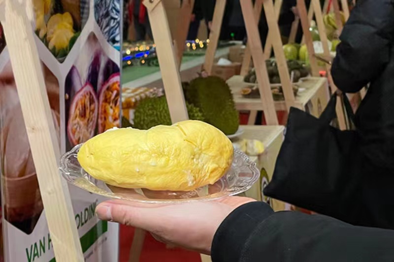 T?ng c?ng có 9 lo?i trái cay Vi?t Nam ???c gi?i thi?u trong hoa?t ???ng này, g?m s?u riêng, xoài, m?ng c?t, thanh long, nh?n, d?a, chu?i và mít, v.v. Ca?c v? khách m??i tham gia hoa?t ???ng ??n khu ??c s?n Vi?t Nam, n?m th? s?u riêng, xoài, thanh long, chu?i, nem rán…ai c?ng t?m t?c khen ngon. ?ng Ly? Ban, nhà nh?p kh?u Trung Qu?c ?ê?n t? ti?nh S?n ??ng cho bi?t:"H?m nay t?i n?m th? s?u riêng Vi?t Nam, cho dù la? mùi th?m, màu s?c hay ch?t l??ng, ?ê?u r?t tuyê?t v??i! T?i nghe nói trái cay Vi?t Nam có l?i th? ? ??ng Nam á, T?i c?ng tin r?ng sa?u riêng Viê?t Nam se? ba?n cha?y ta?i thi? tr???ng Trung Qu?c."