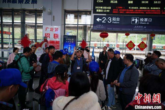 T?i ga Hà Kh?u B?c, huy?n Hà Kh?u, chau H?ng Hà, t?nh Van Nam, m?t h??ng d?n viên ?ang t? ch?c cho ?oàn du l?ch Vi?t Nam ?ang ch? lên tàu.